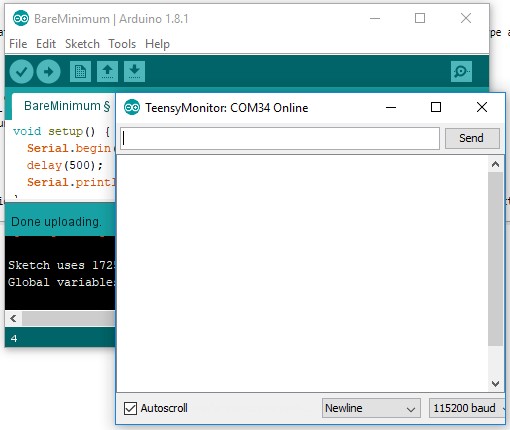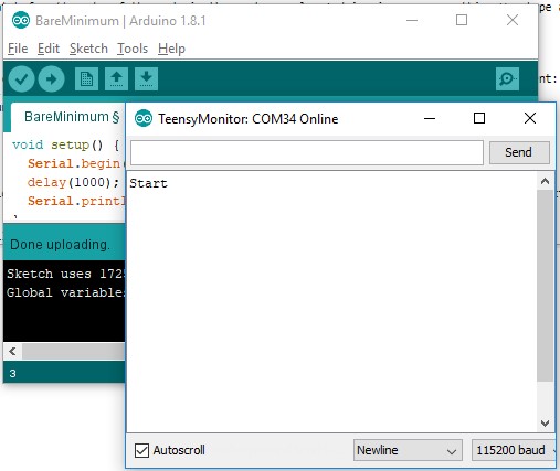 Keep the monitor window open. Press second button (arrow to left, "Upload"). The program will be compiled, uploaded to Teensy and will start immediately. Program will print "Start":