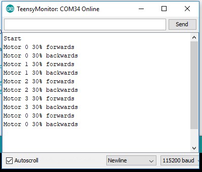 Now run the program as the last one, but first allow the wheels to spin freely, not touching any surface. Monitor should display this: