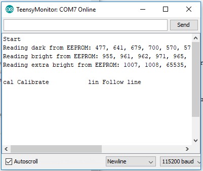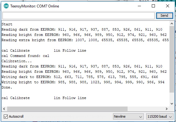 Do not pay attention to EEPROM-related lines yet. The last line lists all the commands You entered (2 of them). You would normally want to have many commands. 50 or 100 is not unusual. If there are so many of them, You will have to group them in submenues, but we will not discuss this topic right now. The action we need the most now is reflectance sensors' calibration. Get ready a white surface with a black line on it. In the top area of the monitor enter Your command's shortcut, in our case "cal", and press "Send":