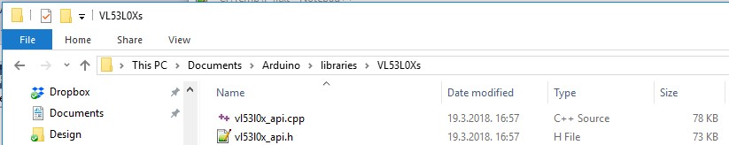 Read lidars.test() function to learn how to measure distances in Your code. Open "C:\Users\[UserName]\Documents\Arduino\libraries\VL53L0Xs" folder (change [UserName]):