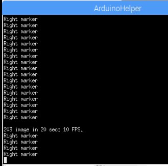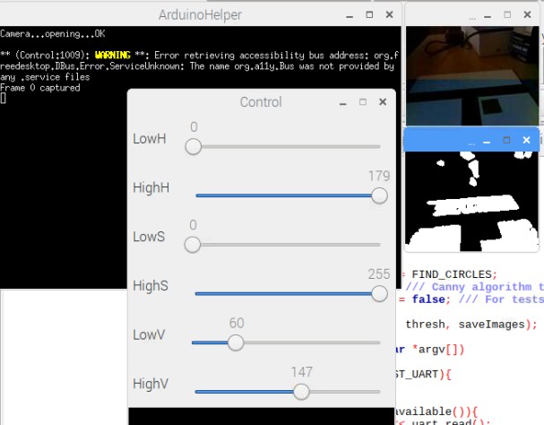 Console window is named "ArduinoHelper". All the results of "cout" in Your program go here. Right below, partly covering ArduinoHelper, is Control, a window with trackbars. You can use them to change some values in Your program, like here: limits for H, S and V. In the upper right corner is the original image and below is the resulting image, after limiting H, S and V values with the values the trackbars show. White areas are what is left (satisfies trackbars' restrictions). Change trackbars and press a key (but not Esc - that will and the program). Execution will continue to the next capture and a different thresholded (black and white) image will be displayed. If there is no progress when You press a key, make sure that one of the windows with images is selected (click on any of them). Otherwise program will not read the pressed key. Now You can experiment, changing the trackbars till You find the correct limits to recognize the green marker You use, for instance.