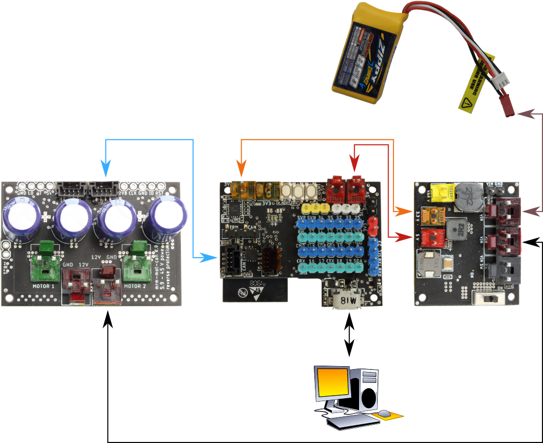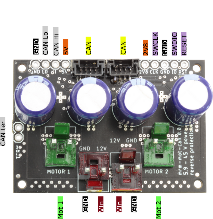 However, this bus is not only intended for ML-R devices, but for any other CAN Bus compatible. You can read here how to connect Your boards to ML-R CAN Bus. For this board, You can supply 5 V to the motor controller by using 5 V (labeled red in the picture left) and GND pins of the 4-pin Dupont 0.1" connector. CAN Bus can be connected to the inner 2 pins of the same connector, LO and HI (CAN Bus low and high).