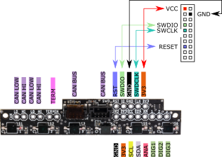 All the ML-R board use SWD interface for programming and all have the same pinout of the connector used for programming. Sequence of pins in a 5-pin Dupont connector is: LogicVoltage, SWCLK, GND, SWDIO, RESET. LogicVoltage is usually 2.8 or 3.3 V. This information uses the programmer to read target board's logic voltage. For example, take a look at MRMS reflectance sensors 6x, CAN, analog, I2C (mrm-ref-can6) depicted left. There is a place for soldering 5-pin Dupont header top left, the holes labeled "RST", "SWDIO",.... That is the programming connector's place. In the picture there is also a standard JTAG connector, the same ST-LINK/V2 and ST-LINK/V3 use. It is bigger than the connector usually found in compatible programmers but it doesn't matter. Just locate the pins needed for SWD.