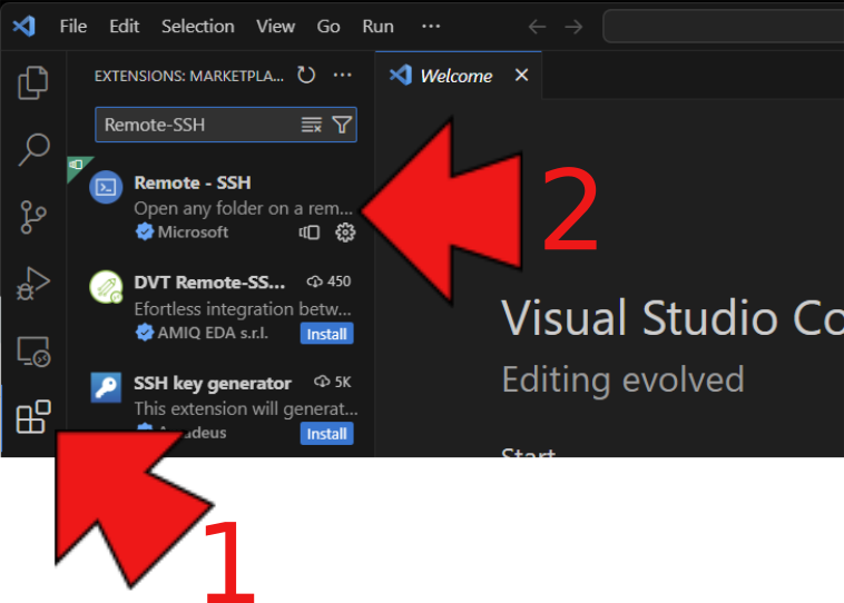 Idite na ekstenzije (1) i instalirajte "Remote - SSH" (2).