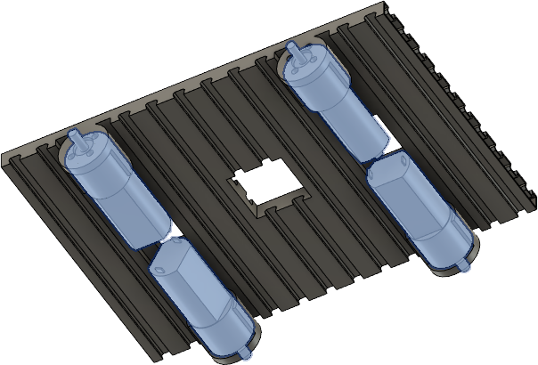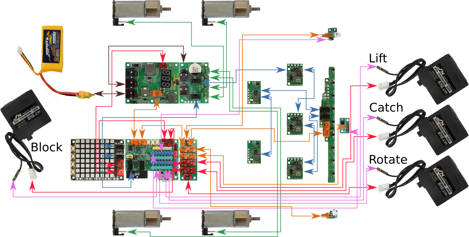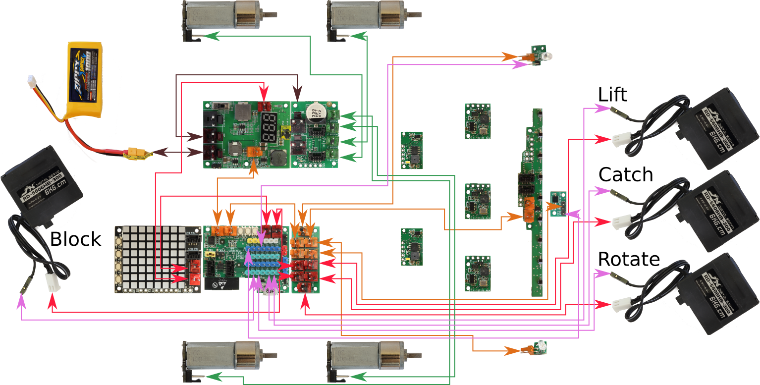 Some of the devices in this picture will be built later and You do not have to connect them right now. However, later always first connect the device and then attach it. Otherwise You will be forced to disassemble the part later, in order to connect it. This hint is valid for next steps, too. In the pictures are 4 servo motors, used for