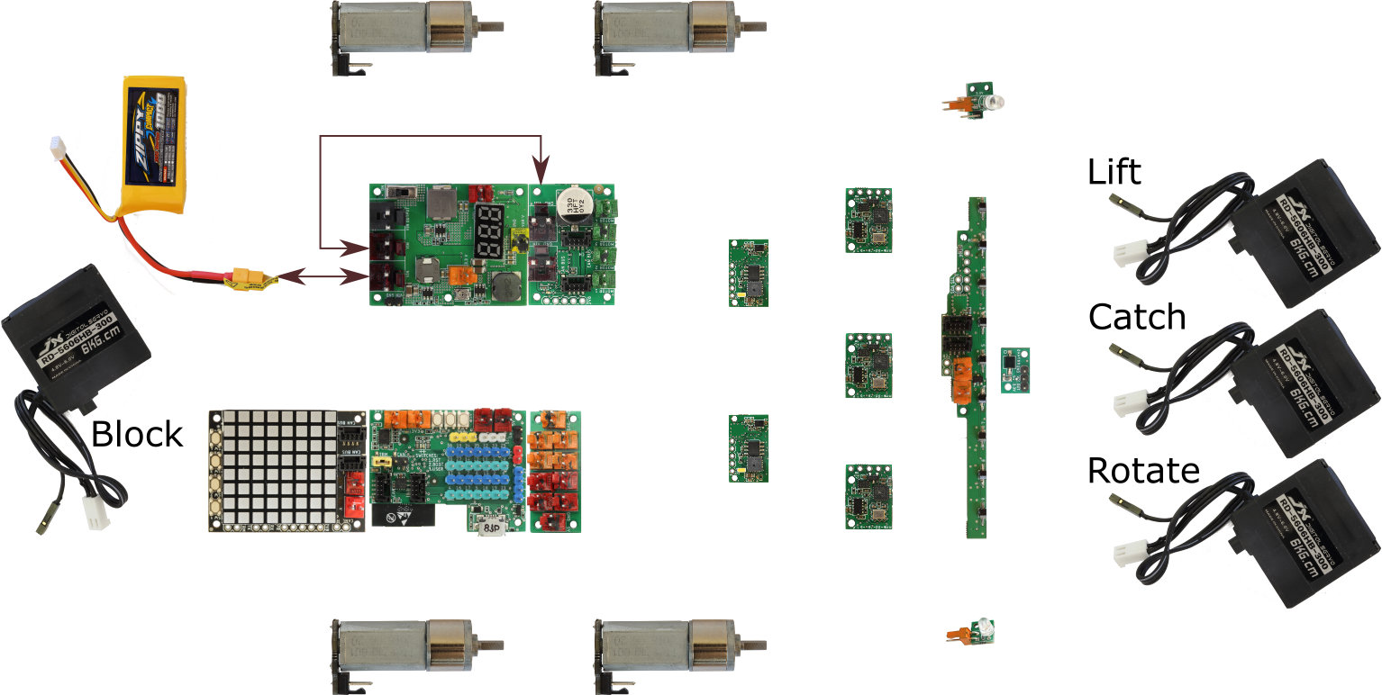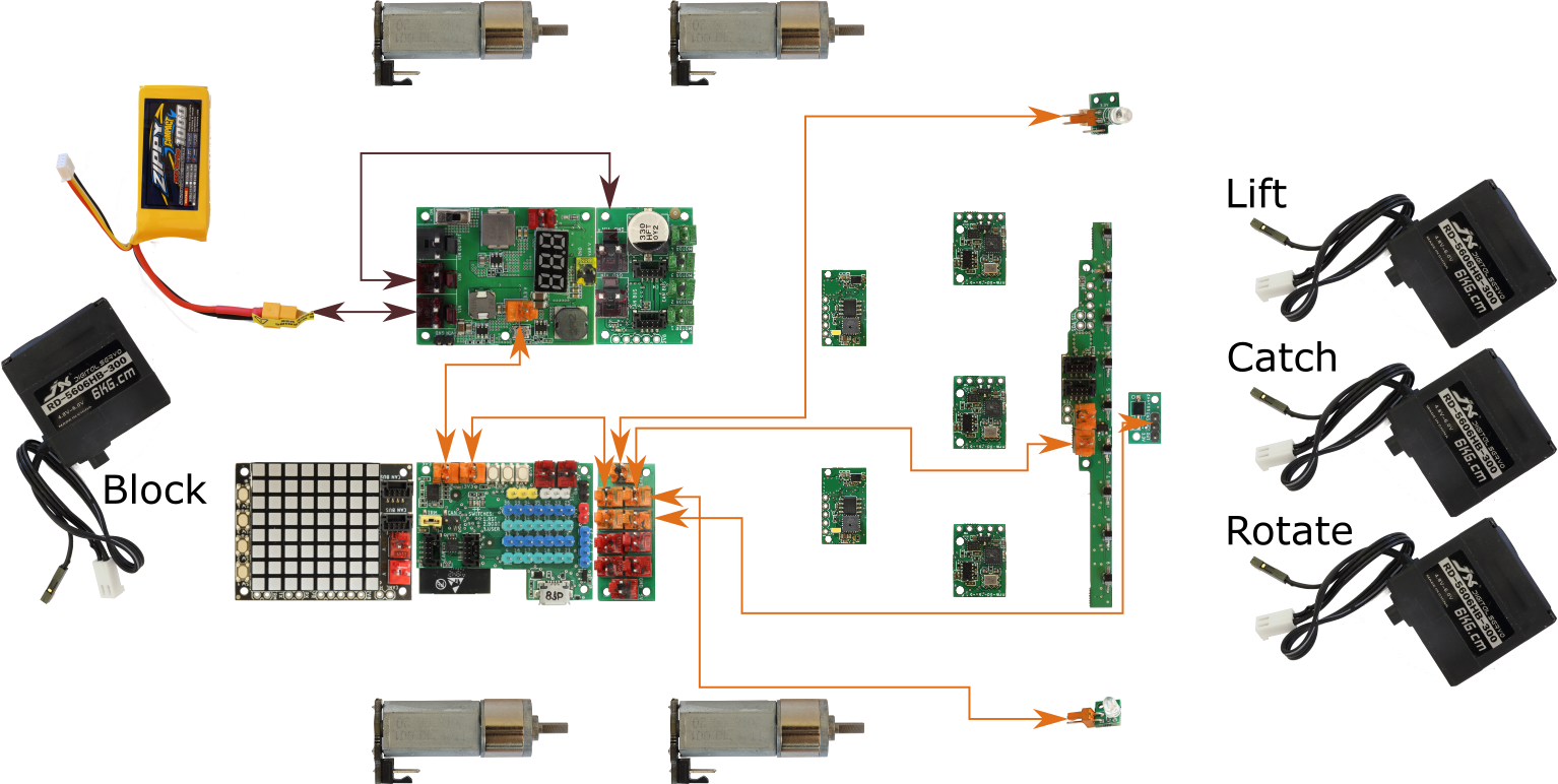 MRMS ESP32: Arduino, IMU, eFuse, BT, WiFi, CAN Bus (mrm-esp32), and so on, according to the picture. Always use the shortest cable possible.