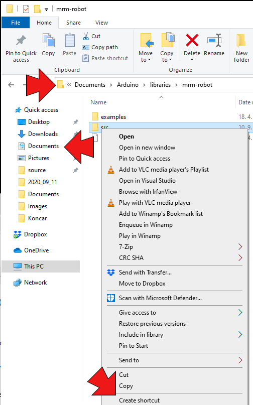 You may want to make a shortcut to the library we will be using, C:\Users\[user name]\Documents\Arduino\libraries\mrm-robot\src. [user name] is, of course, Your user name.