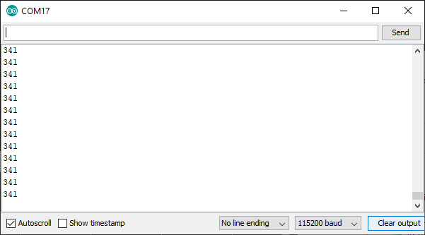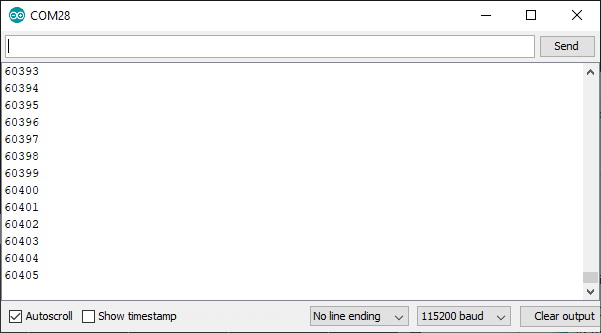 Type "loo" and "Send". The program will be scrolling current time, milliseconds since starting the microprocessor. You can stop it with "x" command.