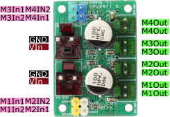 The program will drive all the 4 motors, one by one, first gradually to maximum rotation, then gradually to maximum opposite rotation, and in the end towards stop.
