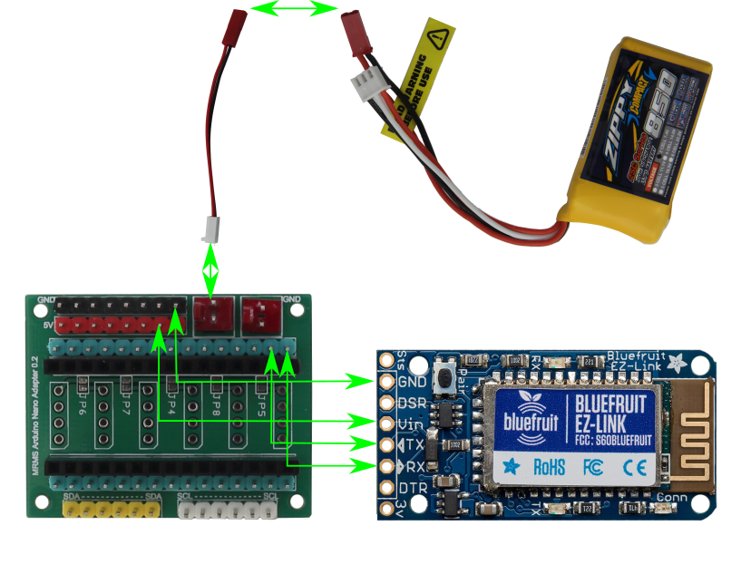 - Spojite kablove po zelenim linijama, sve osim baterije. Gdje je samo zelena linija, bez slike kabla, koristite običan žensko-ženski Dupont kabel.