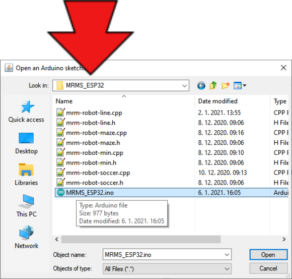 Pronađite "MRMS_ESP32.ino" program u otvorenom direktoriju, kliknite na njega pa na "Open".