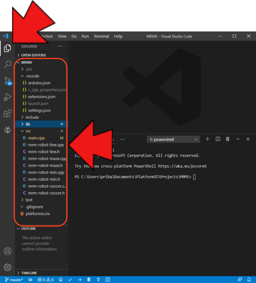 Koncentrirajte se na datoteke za vašeg robota. Ostale "*.h" i "*.cpp" datoteke su za 3 druge vrste robota. Njih je moguće i obrisati, ako nećete programirati druge vrste robota. Cjelokupna programska podrška je, kako vidimo, za razne vrste robota. Nešto što možemo zahvaliti terminu "objektno programiranje".