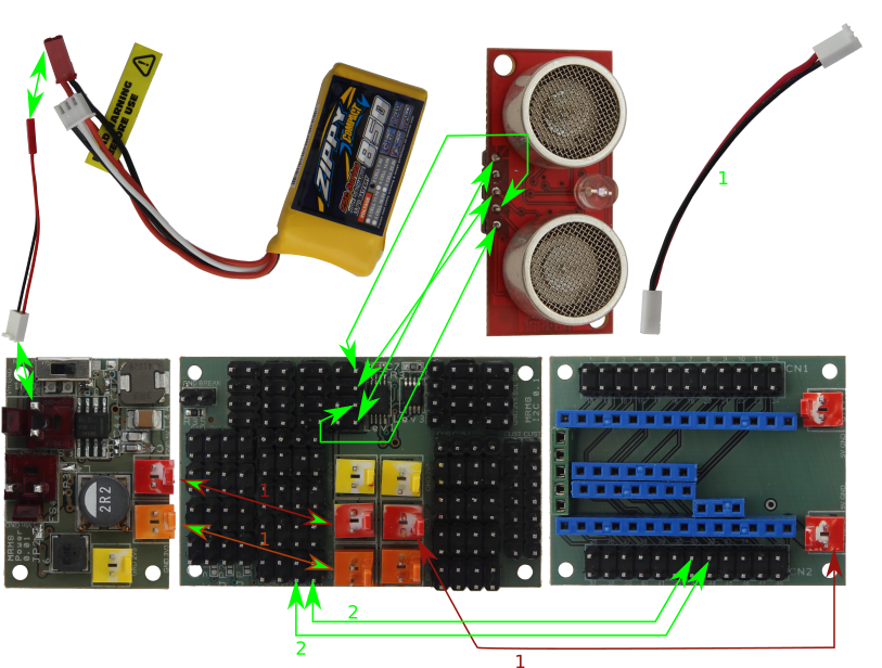 - Spojite kablove po zelenim linijama, sve osim baterije. Zelene linije, za koje nije navedeno koji su kablovi, zamijenite običnim Dupont kablovima.