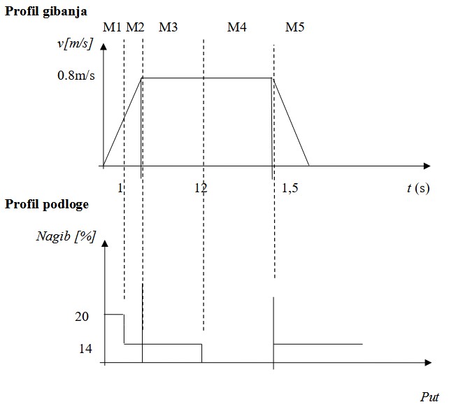Pretpostavimo da robot radi u režimu predstavljenom na Slici 2. Sa Slike 2.(Profil gibanja) vidi se da robot mora ubrzavati do maksimalne brzine od 0,8m/s za jednu sekundu, zatim se kreće postignutom brzinom od 0,8ms (jednoliko gibanje) 12 sekundi te na kraju uspori do stanja mirovanja za 1,5 sekundi.