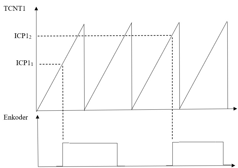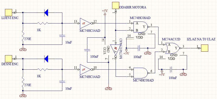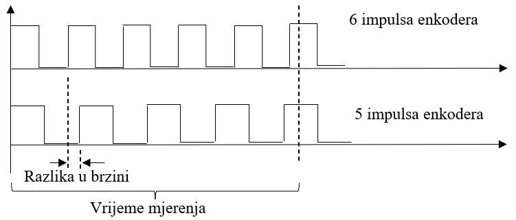 Nakon pred-procesorskih naredbi program svakih 200ms odlazi u ISR(TIMER5_COMPA_vect) prekidnu rutinu gdje prikuplja podatke brojača. Na svaki uzlazni brid kanala B enkodera lijevog kotača program odlazi u ISR(INT0_vect). Kanal B enkodera priključen je na alternativnu (perifernu) jedinicu INT0 koja detektira uzlazni brid. Na priključku PE6 priključen je A kanal istog enkodera. U rutini vanjskog prekida INT0 ispituje se registar PIN, bit 6 grupe priključaka E (PORT-a E) koji je postavljen kao ulazni s priključenim PULL-UP otpornikom. Ispitivanje se provodi kao uvjet grananja i ukoliko je rezultat PINE6==0 zaustavlja se brojač i povećava se vrijednost varijable „smal“, odnosno program je ustanovio da je kanal B enkodera u logičkoj „0“, odnosno robot se giba unazad. Vidi Slika 1. Ukoliko uvjet nije zadovoljen odnosno PINE==1 tada se omogućuje povećanje stanja brojača. U prekidnoj rutini ISR(TIMER5_COMPA_vect) se oduzima stanje varijable „smal“ od stanja TCNT3.