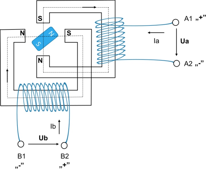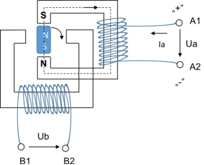 Ukoliko na priključnicu A1 dovedemo pozitivni pol napona, a na priključnicu A2 negativni tada kroz namot protekne struja Ia koja stvori magnetsko tok smjera kao na slici 6. Stvoreni magnetski tok zakrene rotor tako da se suprotni polovi magneta privuku.