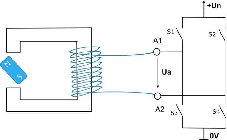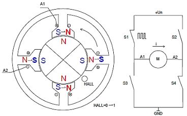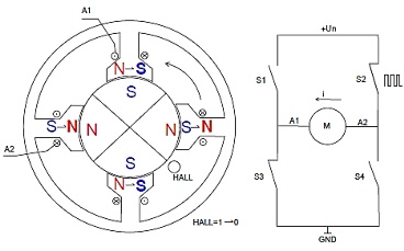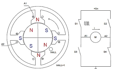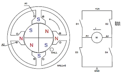 Priključci motora A1 i A2 povezuju se s H-mostom gdje se na prekidački element mosta S1 dovodi PWM signal kojim mijenjamo visinu dovedenog napona na motor. Promjenom napona motora mijenjamo struju, a time i moment motora. Prekidački element S4 trajno na priključnicu motora A2 dovodi negativni pol napajanja. Motor se okreće u smjeru strelice Slika 22. Podatak o poziciji rotora motora daje Hall senzor koji za
