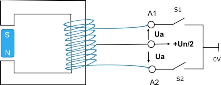 Motorima koji imaju izveden srednji izvod namota moguće je upravljati unipolarno. Srednji izvod je priključen na polovinu nominalnog napona jer napon se dovodi na polovinu namota slika 16. Struja teče kroz namot u istom smjeru, te iz te značajke proizlazi naziv unipolarno upravljanje. Ukoliko se istovremeno uključe obje sklopke dolazi do poništavanja magnetskog polja te se rotor slobodno giba.