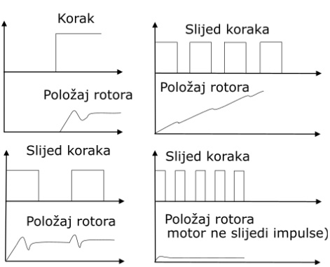 Povećanjem frekvencije slijeda koraka rotor rotira glađe, odnosno uz smanjenje njihanja. Kod određene frekvencije, koja ovisi o momentu tereta, rotor ne prati impulse, odnosno ispada iz sinkronizma s slijedom koraka.