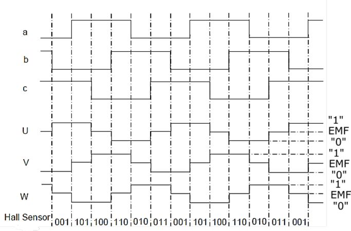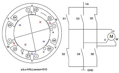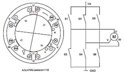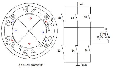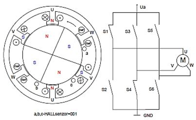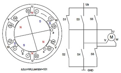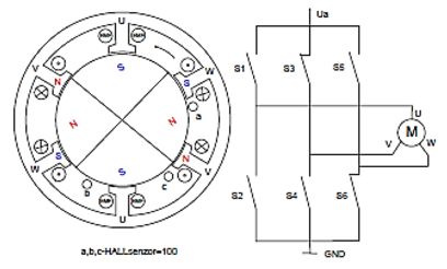 Priključci faza motora dovode se na trofazni H-most kojim mijenjamo polarizaciju polova motora tako da se ostvari zadani smjer vrtnje. Motor ima tri Hall senzora koji daju informaciju o poziciji rotora, te daju nalog prekidačkim elementima H-mosta.
