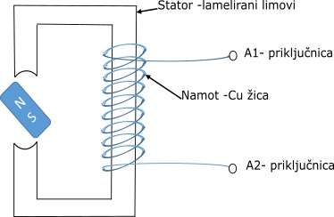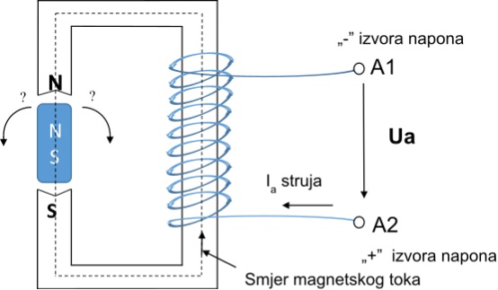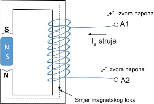 Dovedeni napon na priključke A1 i A2 kroz armaturni (rotorski) namot protjera struju slika1.