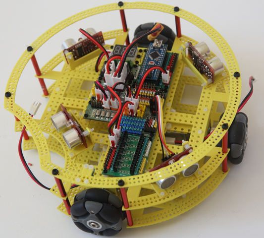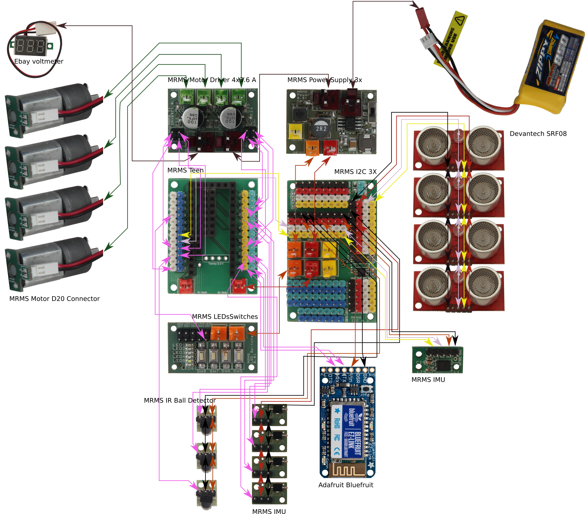 Na slici su samo 3 detektora lopte. Ostale bi treblo spojiti na sličan način kao prikazane: 0 i 3.3 V, treća žica na neki slobodni digitalni pin. Kako bi se smanjio broj žica na slici, ultrazvučni detektori su na slici spojeni jedan na drugi, što ne odgovora mogućem. Svaki detektor treba spojiti nezavisno na I2C sabirnicu 5 V, kao što je spojen gornji.