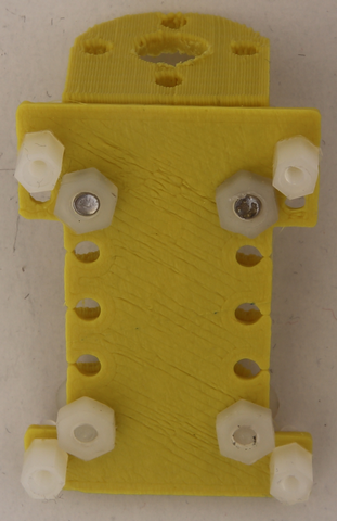 Dva dijela iz prve slike spojite M3 plastičnim i metalnim vijcima i maticama s druge strane, kao što se vidi na slici do. Prednji vijci bi trebali biti metalni jer su tanje glave. Motor je vrlo blizu podloge i velike glave vijaka smetaju. Postavite 4 M2 najlonska distancera 5 mm uz rubove. Tu će ići spoj sa srednjom pločom robota.