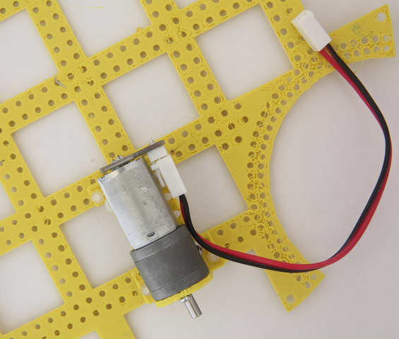 Vijcima M2.5 spojite motore s držačima. Nije loše dodati malo ljepila za fiksiranje vijka ("thread lock" - Ebay). Motori na slici imaju zalemljene pločice s konektorima. Pločice nisu nužne. Moguće je zalemiti žice direktno na kontakte motora. To je ipak lošije rješenje jer je ovaj spoj slaba točka. Micanje žice dovodi do pucanja blizu lemnog mjesta. Sigurniji je spoj krimpanjem.