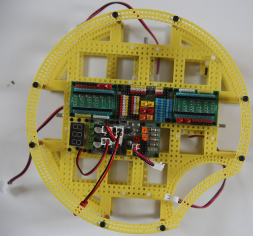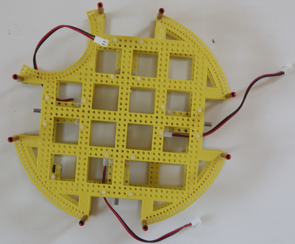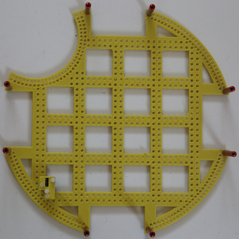 Spojite 4 sklopljena držača motora sa srednjom pločom. Razlikuje se od donje po rupi za bateriju. Znači, ima manje materijala od donje. Na slici je ploča slikana s donje strane.
