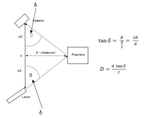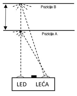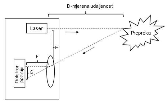 IR svjetlost projicira se iz IR LE diode i difuzno se reflektira od ciljane površine do leće za prikupljanje. Ova leća nalazi se na određenoj udaljenosti u blizini LE diode. Leća fokusira sliku točke na detektor s linearnim nizom (CMOS niz). Položaj točke na pikselima detektora se obrađuje, bilo putem digitalnih ili analognih signala, kako bi se odredila udaljenost do cilja. Zraka se promatra s jedne strane tako da se vidljivo mjesto točke mijenja s udaljenošću od cilja.