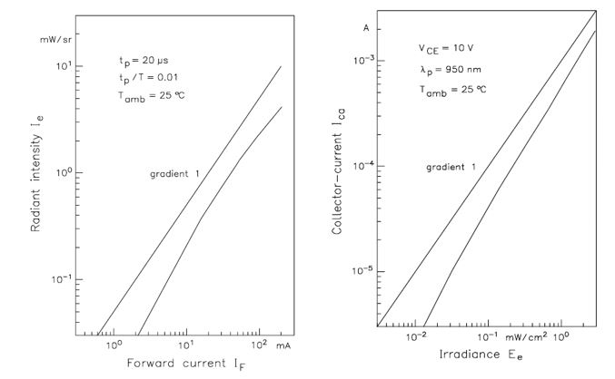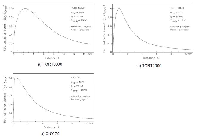 senzora. Relativna kolektorska struja (ili faktor optičke veze) refleksnih senzora za refleksiju na različitim materijalima. Referenca je bijela strana Kodak neutralne kartice. Senzor je postavljen okomito na površinu. Valna duljina je 950 nm pri struji transmitera od IF = 20 mA