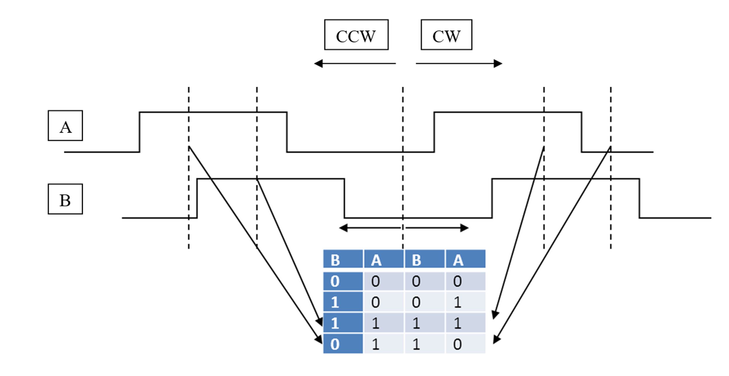 Impulsi na izlazu B su fazno pomaknuti za 90° u odnosu na izlaz A što se ostvaruje fizičkim smještajem faze A i B. Ukoliko se promatra smjer vrtnje (CW) odnosno u smjeru kazaljke na satu tada se prvo pojavi impuls na fazi A, a zatim na fazi B. Kod obrnutog smjera vrtnje od kazaljke na satu (CCW) prvo se pojavi impuls na fazi B a zatim na fazi A. Na taj način se odredi smjer vrtnje, a impuls se prihvati kad su izlazi faze A i faze B u logičkoj jedinici.