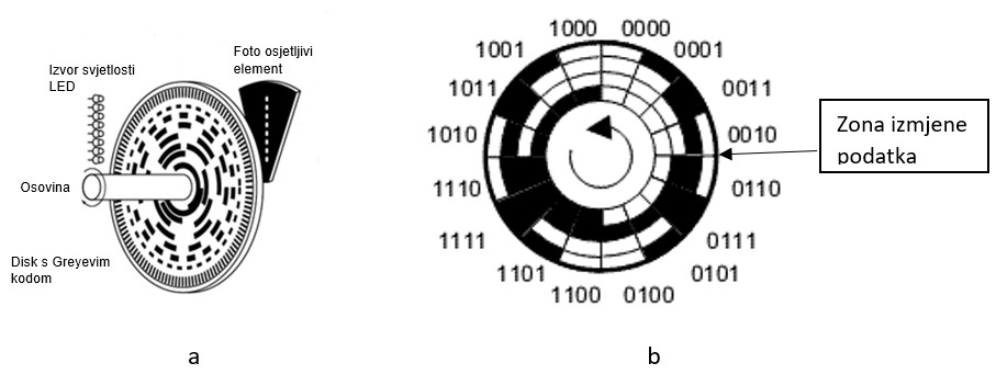 - Apsolutni – uvijek daje podatak o poziciji rotora bez potrebe za brojanjem impulsa. Različitih rezolucija u Grejevom (Frank Gray) kodu.