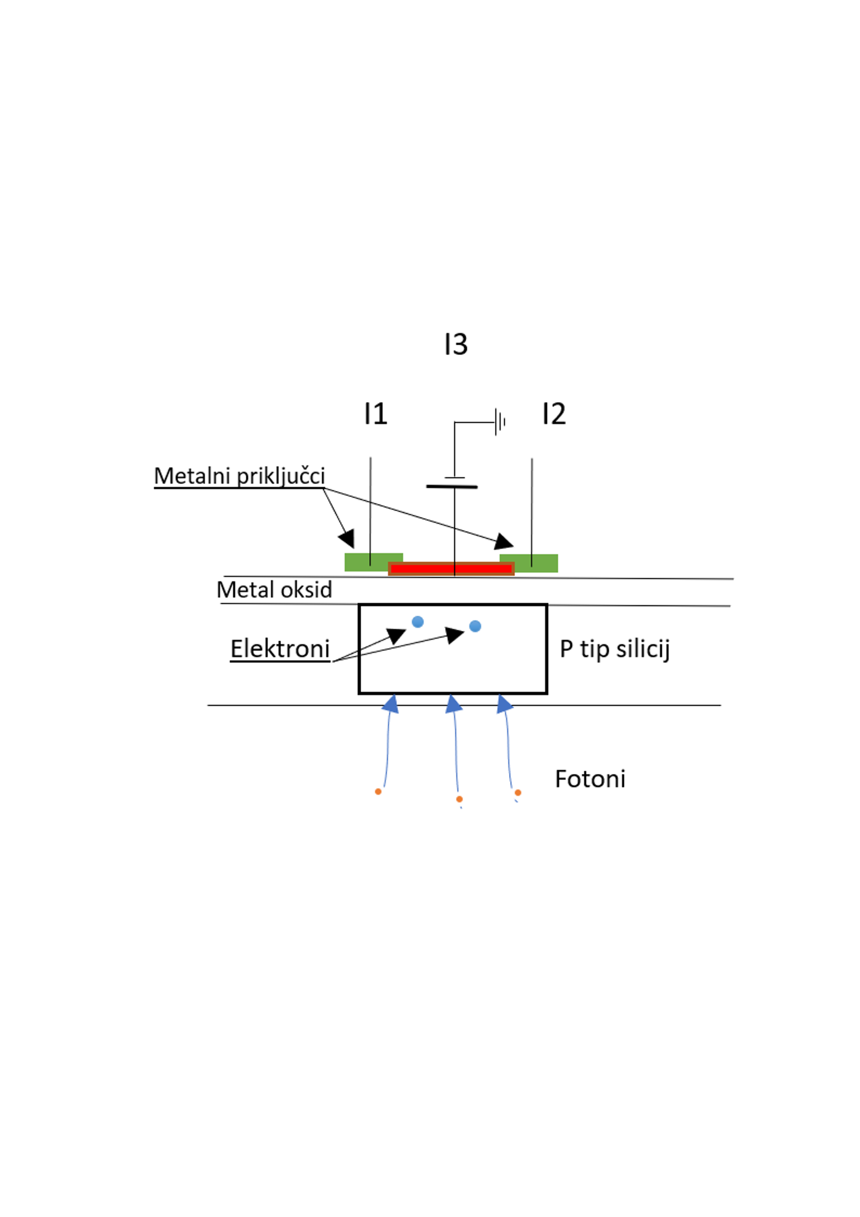 Fotoni koji udaraju o površinu silicija stvaraju slobodne elektrone kroz fotoelektrični efekt.