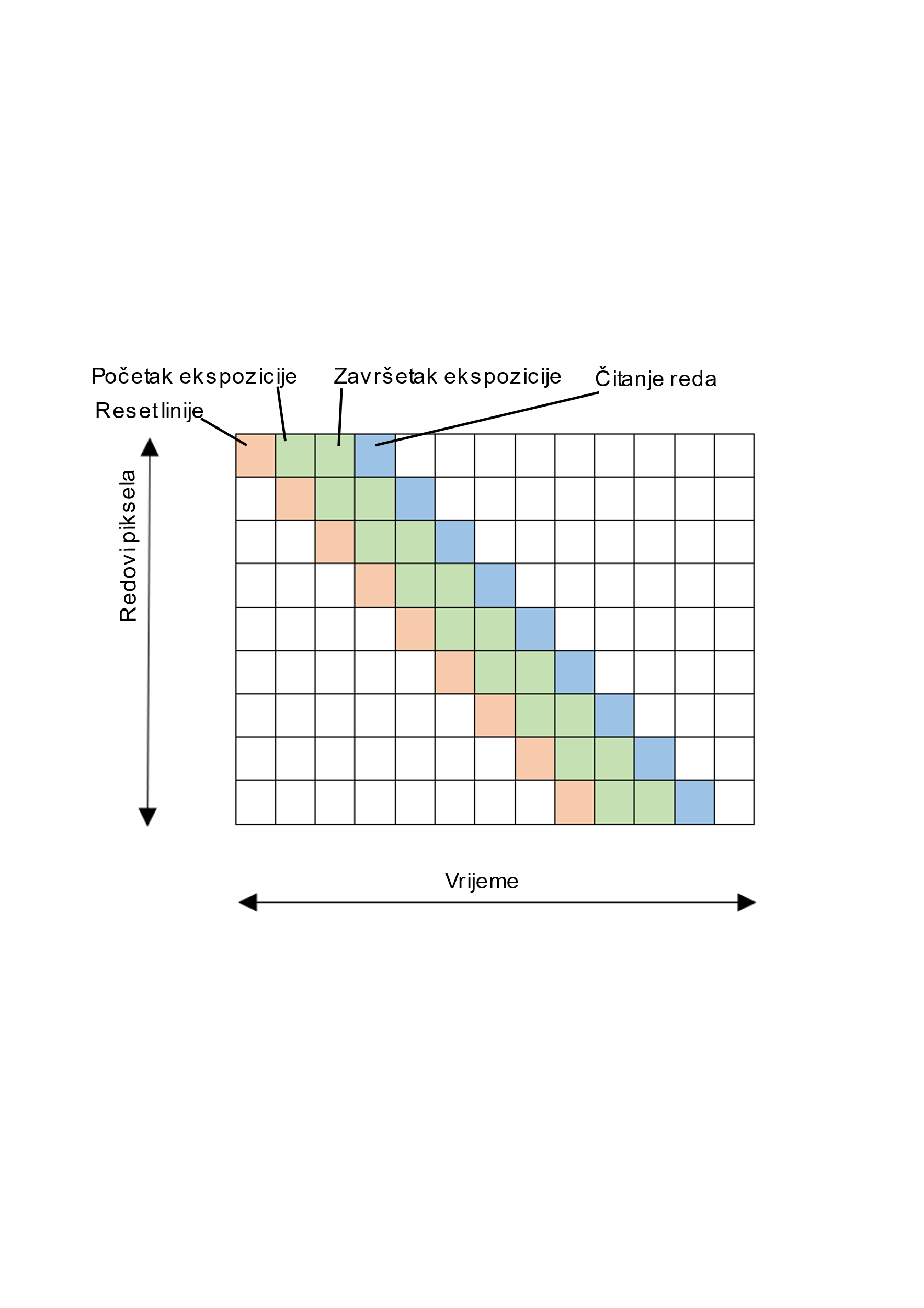 Slika 10. prikazuje vrijeme ekspozicije senzora rolo-zatvarača. Vrijeme ekspozicije je različito redak po redak s resetiranjem i očitavanjem u pomaknutim vremenima. Ova ekspozicija red po red proizvodi izobličenje slike ako su cilj ili kamera u pokretu. Senzori rolo vrata nude izvrsnu osjetljivost za snimanje statičnih ili sporo pokretnih objekata.