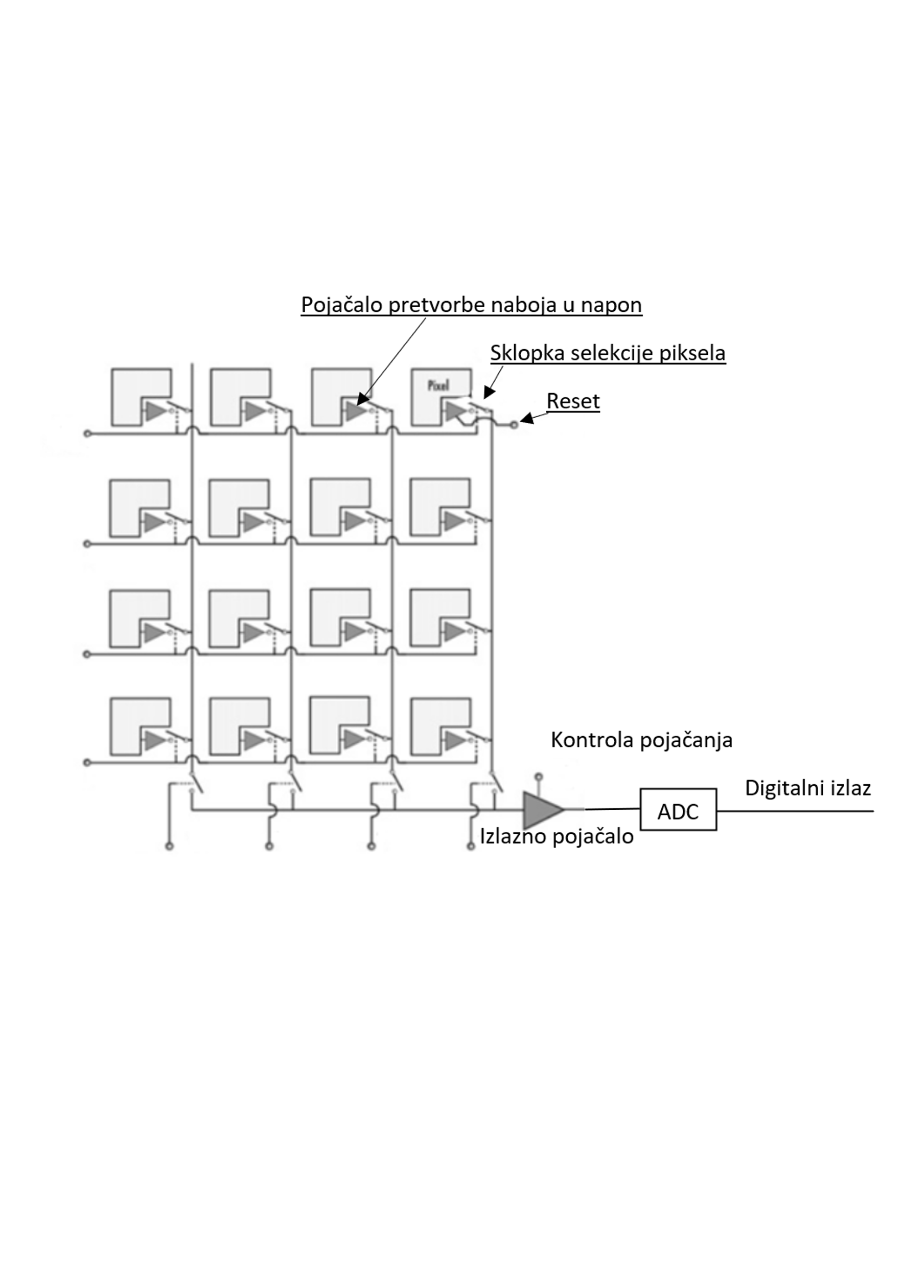 U CMOS senzoru slike, naboj fotoosjetljivog piksela, kojeg generira dioda, na lokaciji piksela pretvara se u napon, a signal se multipleksira kroz redak i stupac i prima ga digitalno-analogni pretvarač slika 4.