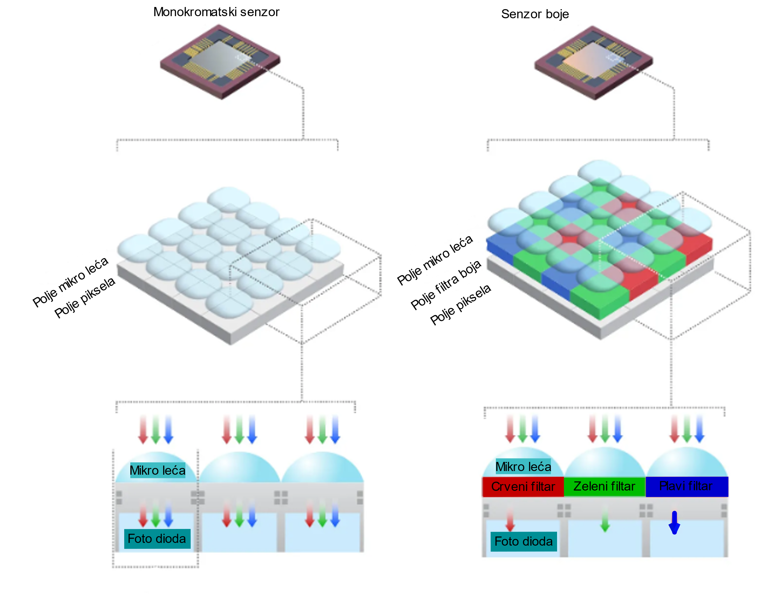 Senzori u boji imaju dodatni sloj koji se nalazi ispod mikro leće, filter u boji, koji apsorbira neželjene valne duljine boje tako da je svaki piksel osjetljiv na određenu valnu duljinu boje slika 7.