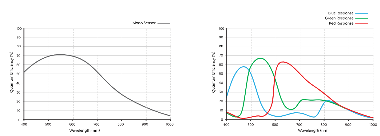 Na osi X je valna duljina (nm), a na osi Y je kvantna učinkovitost (%). Većina kamera u boji za strojni vid ima instalirane IR filtere za blokiranje IR valnih duljina, te time uklanja IC šum i križanje boja sa slike, što najbolje odgovara načinu na koji ljudsko oko tumači boju.