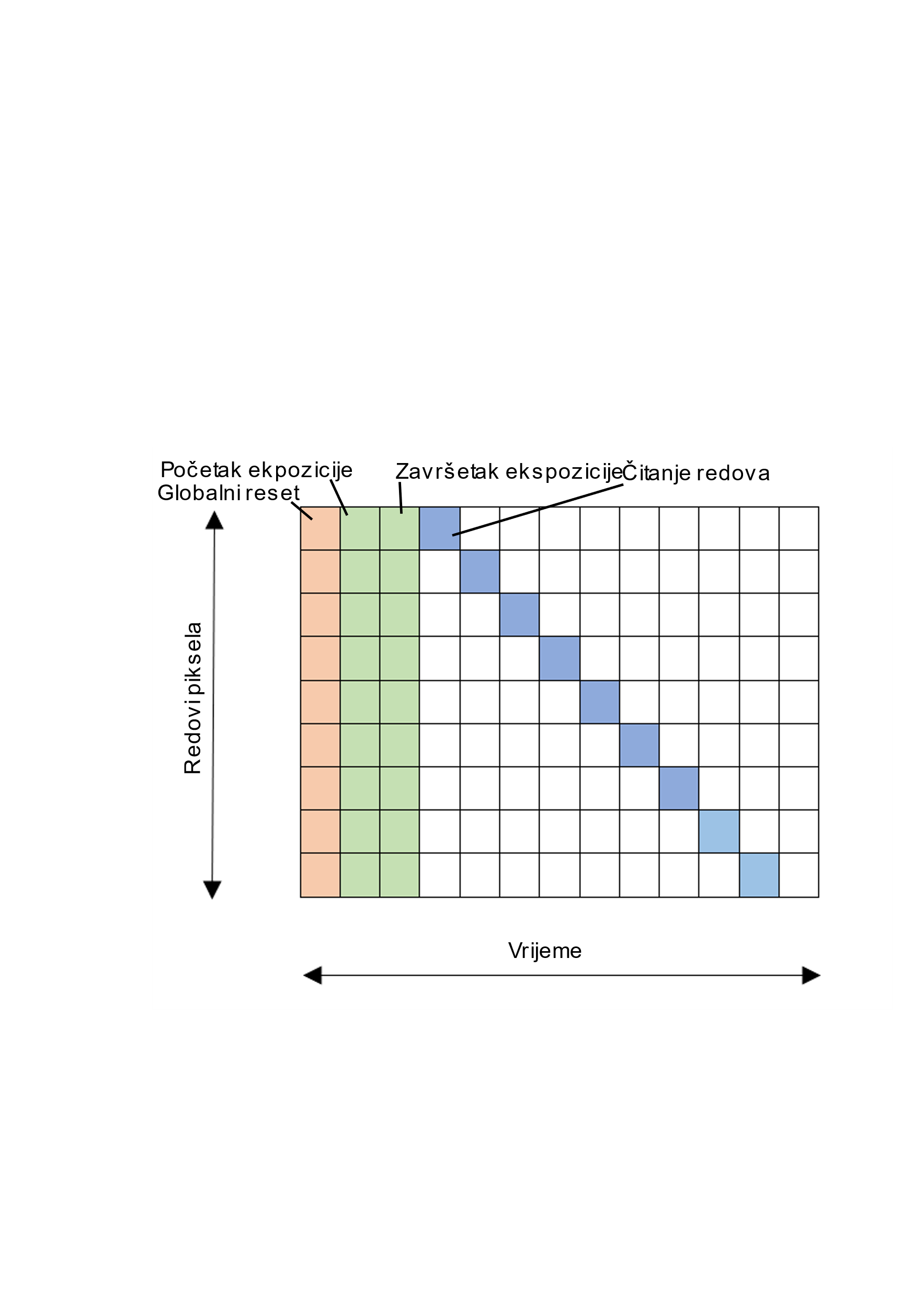 Slika 9. prikazuje vrijeme ekspozicije globalnog senzora zatvarača. Svi pikseli započinju i završavaju ekspoziciju u isto vrijeme, ali očitavanje se i dalje događa red po red. Ovaj vremenski raspored daje slike bez iskrivljenja i njihanja. Globalni senzori zatvarača ključni su za snimanje objekata koji se kreću velikom brzinom.