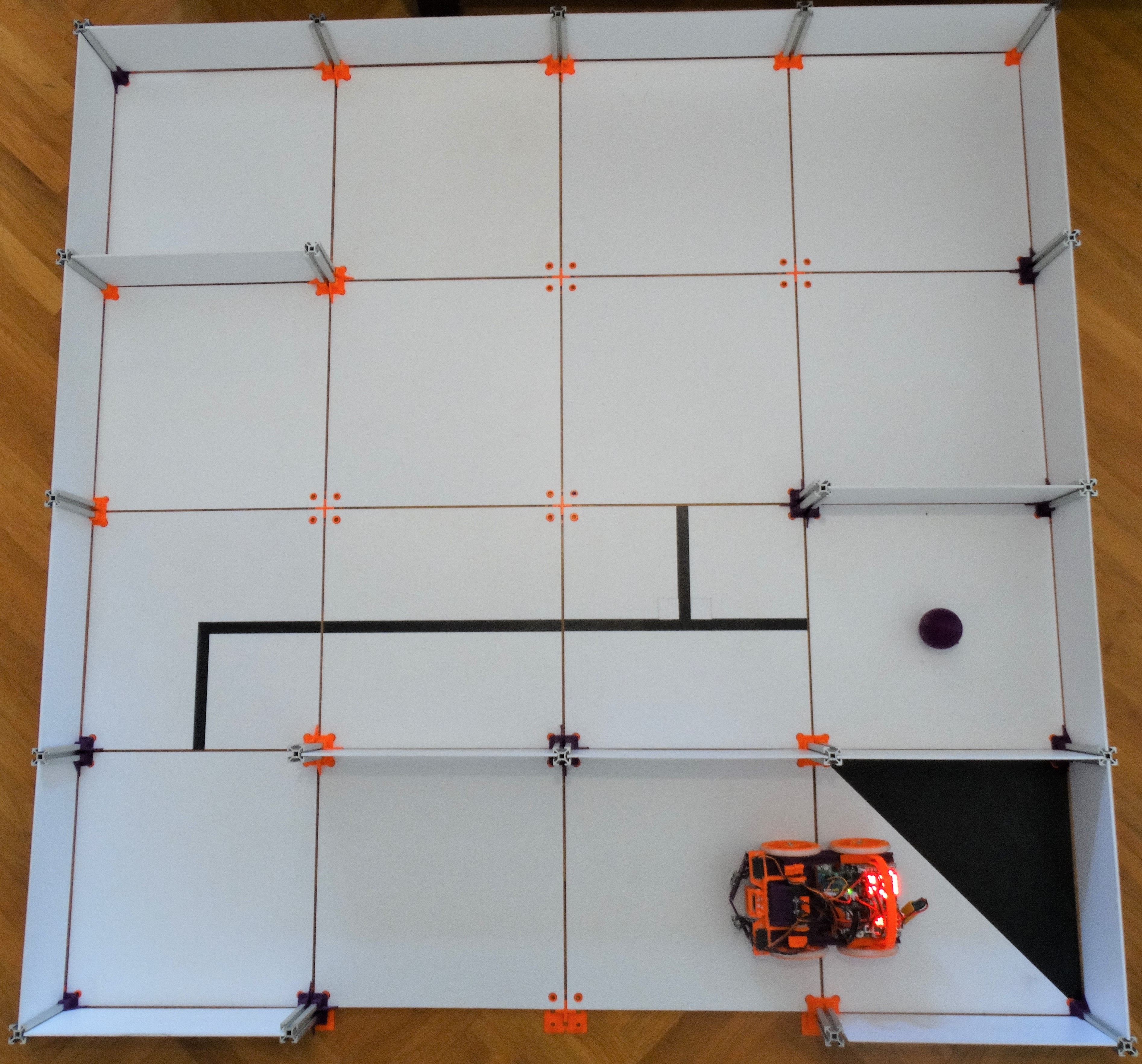 Robot iznosi lopticu iz labirinta i spušta ju na crno polje.