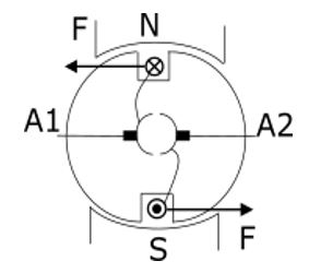 Armaturni namot se nalazi u magnetskom polju permanentnog magneta, a na vodič protjecan strujom u magnetskom polju djeluje sila. Smjer sile određuje se pravilom lijeve ruke,(u dlan lijeve ruke ulaze silnice magnetskog polja, ispruženi prsti pokazuju smjer struje, uzdignuti palac smjer sile).