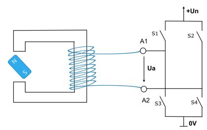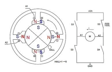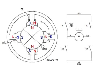 Priključci motora A1 i A2 povezuju se s H-mostom gdje se na prekidački element mosta S1 dovodi PWM signal kojim mijenjamo visinu dovedenog napona na motor. Promjenom napona motora mijenjamo struju, a time i moment motora. Prekidački element S4 trajno na priključnicu motora A2 dovodi negativni pol napajanja. Motor se okreće u smjeru strelice Slika 22. Podatak o poziciji rotora motora daje Hall senzor koji za N pol magneta je u stanju logičke „1“, dok je za S pol u stanju logičke „0“.
