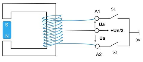 Motorima koji imaju izveden srednji izvod namota moguće je upravljati unipolarno. Srednji izvod je priključen na polovinu nominalnog napona jer napon se dovodi na polovinu namota slika 16. Struja teče kroz namot u istom smjeru, te iz te značajke proizlazi naziv unipolarno upravljanje. Ukoliko se istovremeno uključe obje sklopke dolazi do poništavanja magnetskog polja te se rotor slobodno giba.