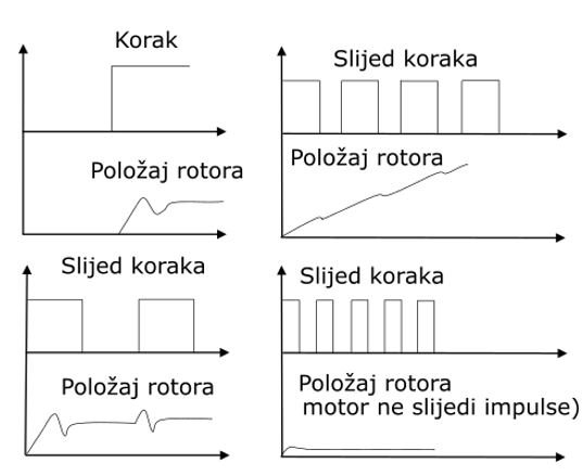 Povećanjem frekvencije slijeda koraka rotor rotira glađe, odnosno uz smanjenje njihanja. Kod određene frekvencije, koja ovisi o momentu tereta, rotor ne prati impulse, odnosno ispada iz sinkronizma s slijedom koraka.