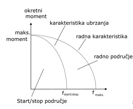 - Zaletna karakteristika odnosno karakteristika ubrzanja daje najveći moment tereta koji motor može svladati kod određene startne frekvencije. Područje ispod karakteristike naziva se „Start/stop područje.