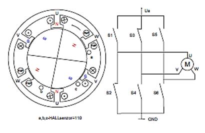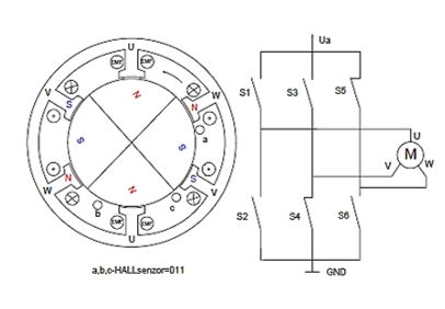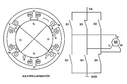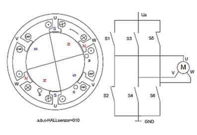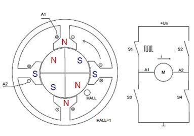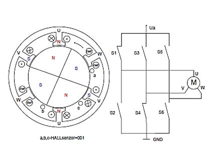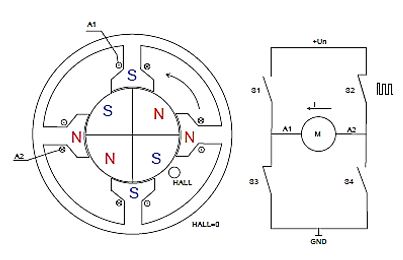 Priključci faza motora dovode se na trofazni H-most kojim mijenjamo polarizaciju polova motora tako da se ostvari zadani smjer vrtnje. Motor ima tri Hall senzora koji daju informaciju o poziciji rotora, te daju nalog prekidačkim elementima H-mosta.