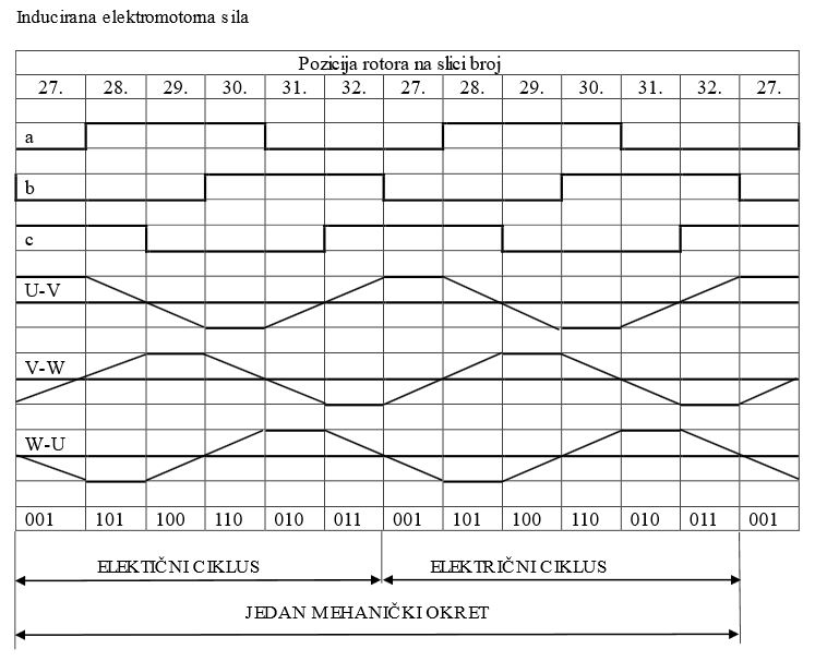 Čim rotor prođe Hallov senzor, regulator prebacuje istosmjerni napon na sljedeću fazu (“U”, “V” ili “W”). Stoga je algoritam upravljanja prilično jednostavan i zahtijeva jednostavni mikrokontroler za izvršavanje algoritama. Kao što je prikazano na slici 33, upravljački napon na fazama motora ima pravokutni oblik. Ovaj pravokutni oblik napona rezultira trapezoidnim oblikom struje i povratne EMF (elektro motorne sile) u stroju slika 34.