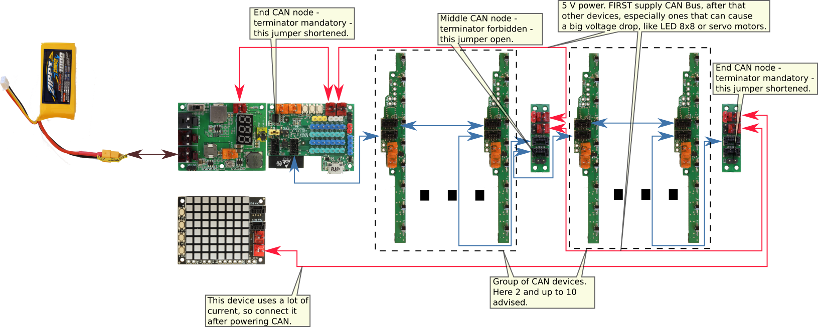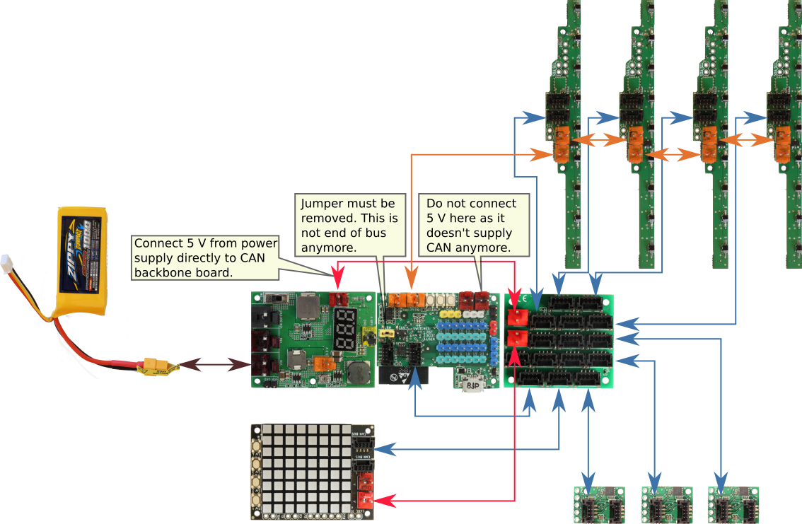 Jedinice su povezane tankim CAN kablovima (plave linije), kako bi konektori bili što manji i robot kompaktniji. Posljedica je da i na ovim žicama postoji pad napona koje je potrebno minimizirati. Na slici su 2 grupe, što je obično previše za male robote, koji mogu imati samo jednu grupu.