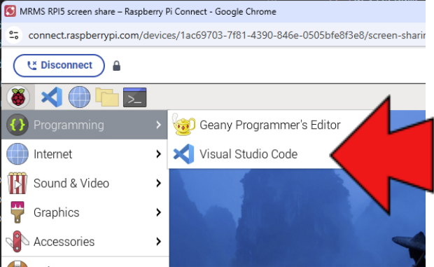 Start remote console on Your desktop PC, after switching the robot on. Start VS Code by selecting it from drop-down menu.
