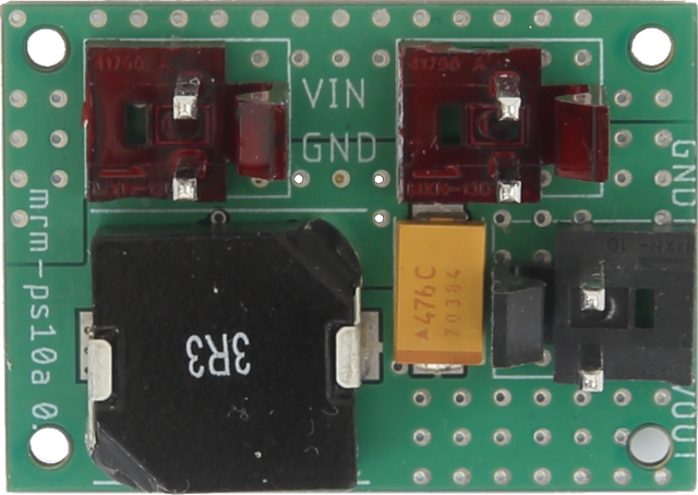 2 visokoučinkovita pretvarača napona baterije (6.5 - 16 V) u 3.3 V (3 A) i 5 V (17 A). Elektronički prekidač. Zaštita od obrnutog, previsokog i preniskog ulaznog napona, ulazni EMC filter. Voltmetar. Zaštita od podnapona je postavljena 3-ćelijske baterije tako da ulazni napon treba biti veći od 9 V. Ako se radi o većoj seriji, možemo ga postaviti na 6.5 V.